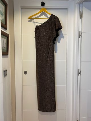 Elegante mono largo con un diseño asimétrico y tela brillante. Perfecto para eventos especiales. - Diseño de un solo hombro. - Tejido con acabado metalizado dorado y marrón. - Corte largo y ajustado. - talla grande al ser elástico da hasta una 40 - medidas largo 1.50, pecho 50 Puesto en una ocasión