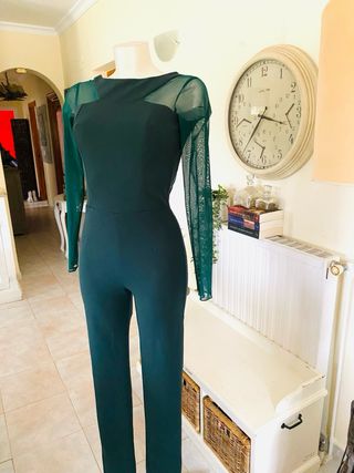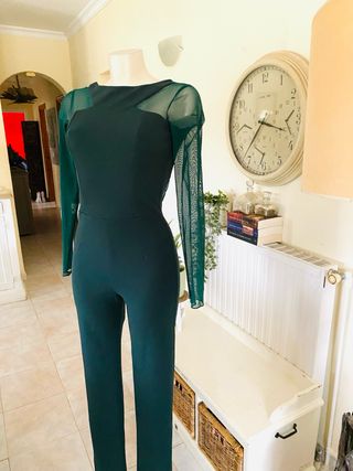 Precioso mono en color verde esmeralda de Marta en Brazil, talla S. Un diseño sofisticado y muy favorecedor con mangas largas de tul transparente y espectacular espalda abierta con botones dorados. El corte es entallado y estiliza muchísimo la figura. Perfecto para eventos, cenas especiales, fiestas, Navidad, Nochevieja o cualquier ocasión elegante. Mangas de tul transparente Espalda abierta con detalle de botones Corte ajustado y femenino *r Tejido fluido y cómodo * 100% poliéster (no se arruga fácilmente) En muy buen estado.
