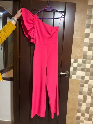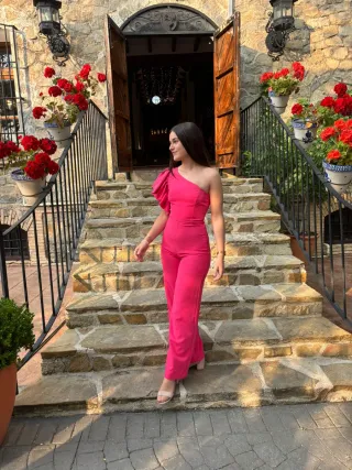 Estiloso mono en color fucsia, sin mangas, escote sobre los hombros marcando ondas, aberturas laterales en las piernas que están cerradas mediante unas puntadas de hilo que se pueden soltar y dejarlas más abiertas, se abrocha a la espalda mediante cremallera, tela con buena caída. Regalo cinturón a juego, que se compró aparte ya que el mono venía sin el. Se ha llevado en un solo evento.