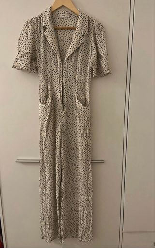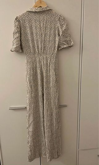Mono de Zara, talla S. Cuello halter y abertura en escote y espalda. Uno de los enganches de los botones está roto. En la cintura tiene dos trabillas para poner un cinturón y una de ellas está a punto de romperse. Se cierra a la espalda con cremallera. Composición 100% viscosa.
