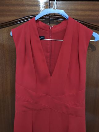 Precioso mono rojo, ideal para una ocasión especial. Es de color salmón intenso y tiene un corte favorecedor. - Escote pronunciado. - Sin mangas. - Diseño elegante y sofisticado. - Talla 38