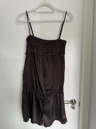 Mono corto de la marca Guess en color marrón. Presenta un diseño con tirantes finos y cintura elástica. - Tejido satinado. - Detalle de cordón en la cintura. - Logo de la marca bordado.