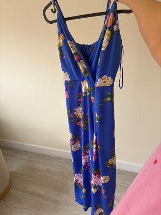 Precioso mono largo azul con estampado floral. Ideal para cualquier ocasión. - Escote en pico. - Tirantes finos. - Corte amplio y favorecedor. - Tejido ligero y fluido.