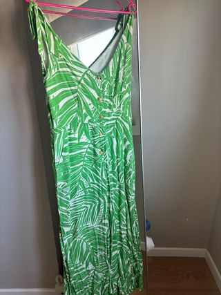 Es un vestido de punto fino largo negro combinado los tirantes con dorado, tiene un corte original arriba, aberturas laterales. Muy mono Usado una sola vez