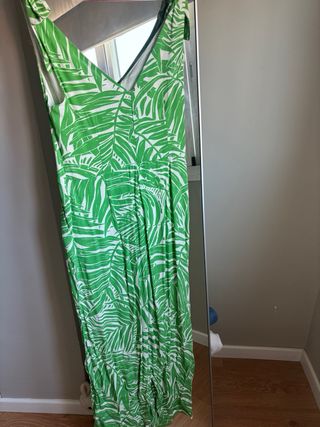 Mono color lila con cuello de pico, muy cómodo, goma en bajo pantalón, tejido fresquito, no elástico, no se transparenta. Paso medidas a continuación pecho 130 cm caderas 140 cm largo 145 cm mangas 25 cm bíceps 36 cm