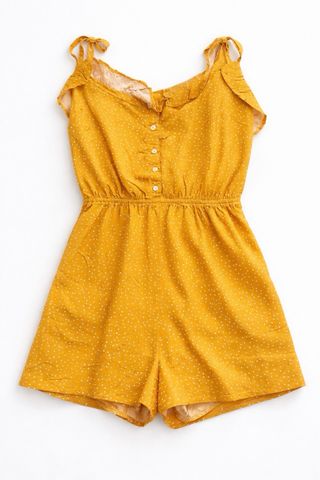 Mono corto de Bershka en color amarillo con estampado de lunares blancos. Tiene tirantes finos y cintura elástica. - Diseño con volantes en el escote. - Cierre de botones en la parte delantera. Pone L en la etiqueta pero talla pequeño.