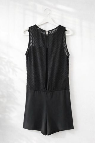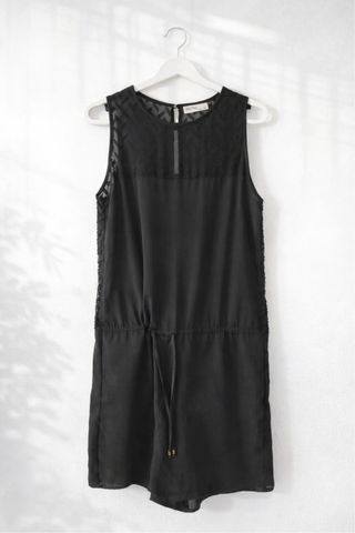 Precioso mono negro de verano. Es ligero y fluido, ideal para los días calurosos. Con cinta delantera para hacer lazo y con espalda abierta. Muy facorecedor - Escote redondo. - Sin mangas. - Cierre con cordón en la cintura. - Corte por encima de la rodilla.