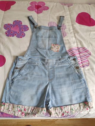 Mono peto de mujer pantalón pierna ancha con bolsillos tejido algodón grueso vaquero con flores muy bonito es talla M pero da para L más bien.Esta sin usar ver sin compromiso.valdria para embarazada