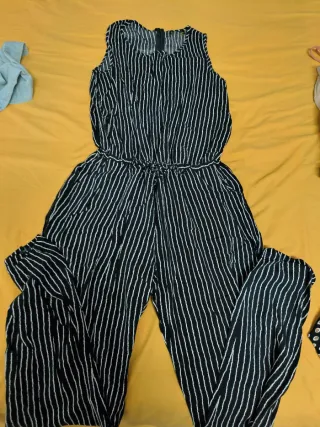 Escrito XXL pero es pequeño, así que es L. Mono de vestir con estampado de rayas verticales. Diseño sin mangas y cintura ajustable con cordón. - Estampado de rayas blancas sobre fondo negro. - Cierre de cremallera en la parte delantera. - Piernas largas y anchas.