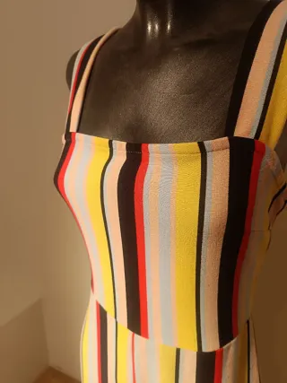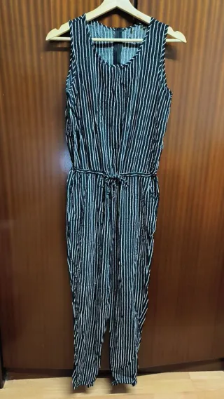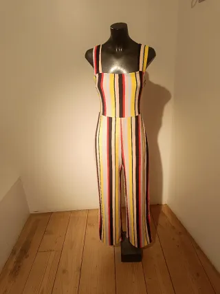 Mono de cuerpo entero con un diseño de rayas verticales en varios colores. Presenta un corte recto en las piernas y tirantes anchos. Es elástico 40 cms de sisa a sisa 36 cms cintura 133 cms de largo total desde el hombro