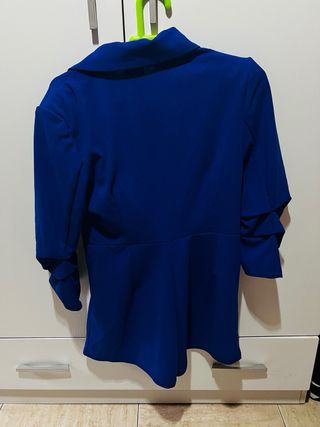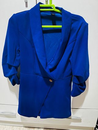 Mono corto de color azul eléctrico con un diseño moderno y elegante. - Manga larga abullonada. - Cierre cruzado con un botón. - Corte asimétrico en la falda.