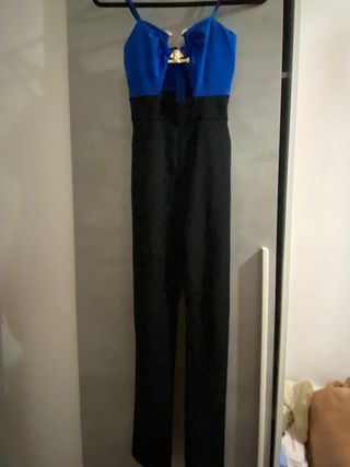 Mono elegante de dos tonos, con un diseño moderno y llamativo. - Parte superior en azul vibrante. - Parte inferior en negro. - Detalle de aro dorado en la zona del escote. - Abertura en el abdomen. - Piernas largas con abertura lateral.