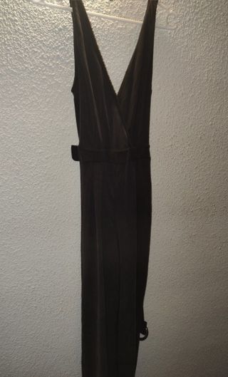 Elegante mono de terciopelo con manga larga. - Tejido suave y brillante. - Diseño cruzado en el torso. - Piernas anchas y fluidas. - Cinturón a juego. Aunque figura una L de talla, el tamaño es más próximo a una M.