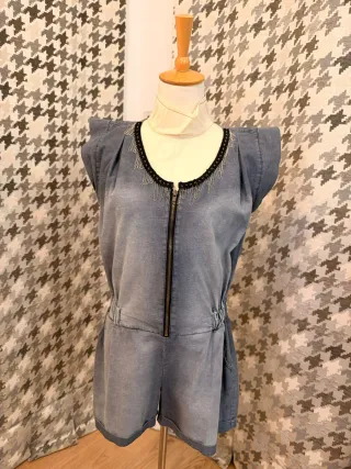 Mono corto de estilo vaquero con detalles únicos. - Diseño con cremallera frontal. - Adorno de abalorios en el cuello. - Cintura elástica para mayor comodidad. - Mangas cortas con hombros marcados.