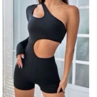 Mono negro con diseño híbrido, combinando manga larga y pierna corta. - Corte asimétrico. - Detalle de fruncido en la cintura. - Aberturas laterales.