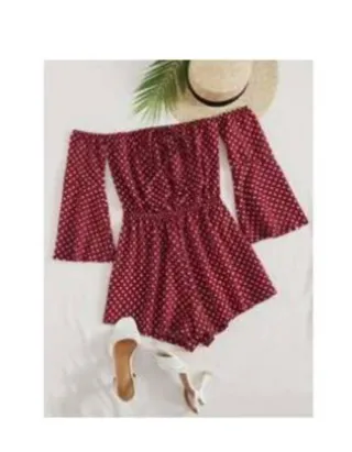 Mono corto con estampado de lunares, ideal para un look veraniego. - Diseño de hombros descubiertos. - Mangas acampanadas. - Cintura elástica.