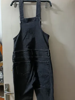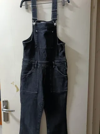 Peto vaquero de color negro con pantalón largo. - Diseño con tirantes ajustables. - Bolsillos delanteros y traseros. - Detalle de botones en los laterales (le falta uno)