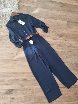 Mono largo de color azul con cinturón marrón a juego. Ideal para un look elegante y cómodo. - Manga larga con opción de remangarse. - Cuello camisero. - Cierre de botones. - Cinturón con hebilla. - Bolsillos en la parte delantera.