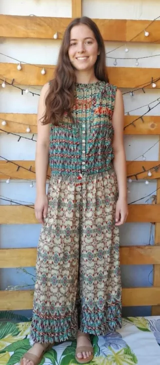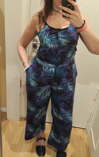Mono largo de verano con un vibrante estampado. De Fórmula Joven, talla 42. Tiene un pequeño descosido (ver foto) - Diseño de tirantes. - Piernas anchas y fluidas. - Estampado tropical llamativo.