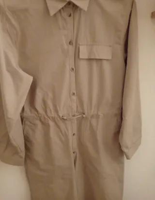 Mono largo de manga 3/4 en color marrón claro. Diseño recto con cintura ajustable y cierre frontal estilo camisa. Bolsillos laterales y en el pecho. Talla XS/S al ser ajustable 100% algodón Modelo único muy original y favorecedor. Me costó 60€