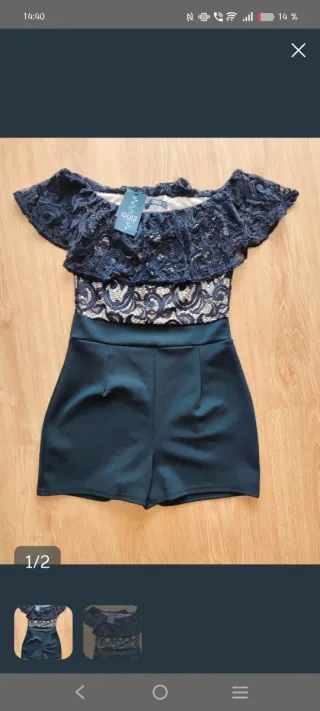 Mono corto de la marca Quiz con diseño de encaje. - Escote Bardot. - Mangas cortas acampanadas. - Cintura marcada. - Pantalón corto satinado.