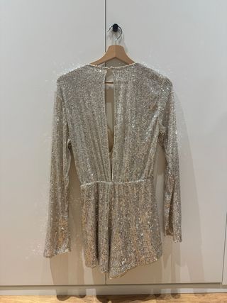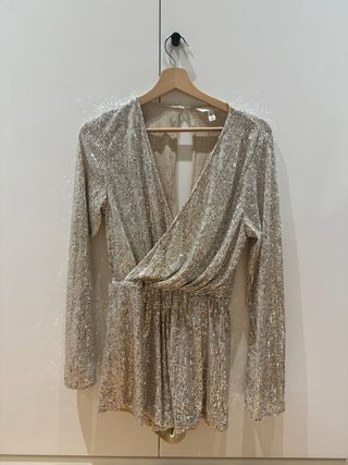 Mono de H&M con un diseño brillante y elegante. - Tejido con lentejuelas doradas y plateadas. - Escote cruzado. - Manga larga. - Corte drapeado en la cintura.