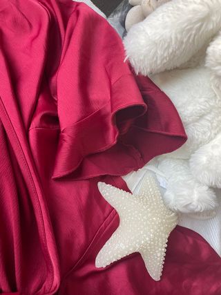 Tejido fluido y muy suave y cómodo. Diseño cruzado, recto, largo y estampado. Cierre de botones en el cuello. Sin mangas. Lazo ajustable en la cintura. Forro interior Está a estrenar y me costó casi 70€