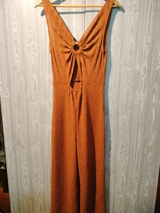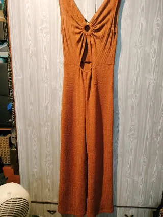 Buzo estilo Selena Quintanilla precioso y sienta fenomenal -Color cobre -Pierna ancha y fluida -Textura tipo ganchillo/canalé -Elastico, se adapta a la figura -Talla única, sirve tanto para una 38/40 -Corte en la cintura Cut Out -Escote en V, con detalle de anilla
