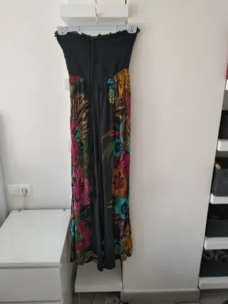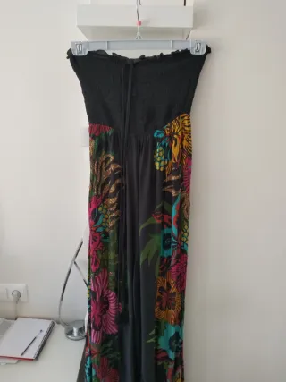 Mono largo de la marca Desigual con un vibrante estampado floral.Sienta muy bien. - Diseño sin tirantes con corpiño fruncido. - Estampado multicolor con detalles dorados. - Piernas anchas y fluidas.