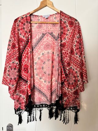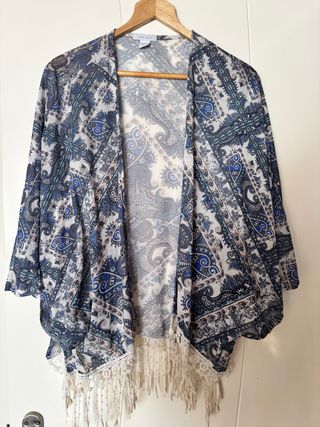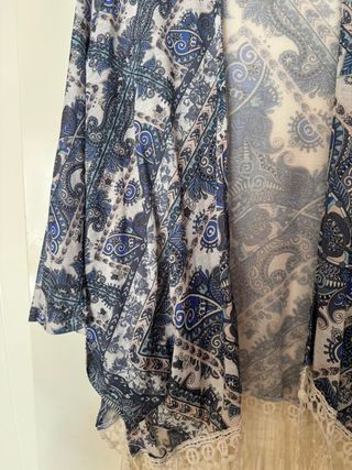 Fular estilo bohemio con un bonito estampado. - Diseño con flecos en el bajo. - Talla M/L.