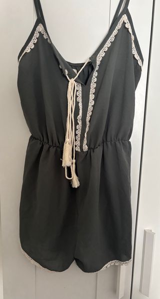 Mono corto de tirantes con un diseño veraniego y detalles de encaje. - Marca local - Tirantes finos. - Escote con cordones y borlas. - Cintura elástica. - Bajo con borde de encaje. **Solo envios**