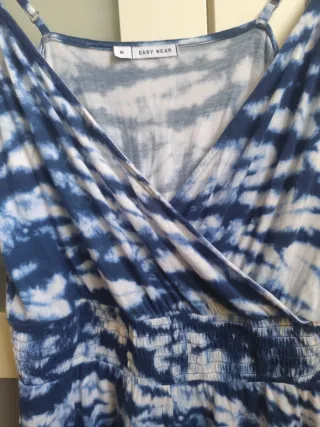 Mono corto con estampado tie-dye en tonos azules y blancos. Con un diseño cruzado en la parte delantera y cintura elástica. Tirantes finos ajustables. Talla M. Muy cómodo. En perfecto estado.