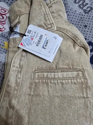Mono de tirantes con cinturón (se puede atar delante o detrás). Pantalón ancho. Tela “gordita”; muy cómodo
