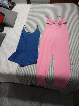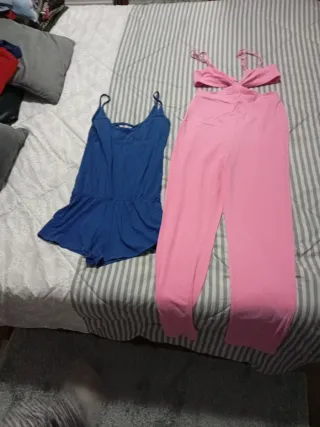 Conjunto de dos petos, uno azul y otro rosa. - Peto azul de tirantes finos. Marca INSIDE, talla XS . Con la espalda al aire. Pero corto - Peto rosa con diseño cut-out en el torso. Marca SHEIN. Pero largo. Talla 36