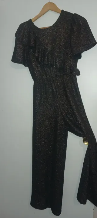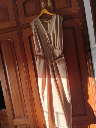 Elegante mono de Zara, perfecto para eventos especiales. Está sin estrenar. No me está bien y se me pasó el plazo para devolverlo. Es de esta temporada. - Escote en V pronunciado. - Detalle metálico dorado en el escote. - Cinturón fino a juego. - Manga sisa. - Pierna ancha.