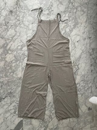 Mono de rayas verticales en tonos grises y blancos. Un básico cómodo y versátil. - Tirantes ajustables con lazada. - Pierna ancha y cropped.