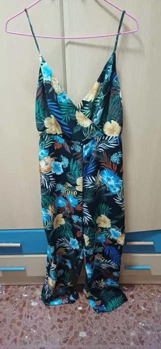 Mono largo con estampado floral vibrante. Ideal para un look llamativo y fresco. Diseño con tirantes finos graduales, escote pronunciado y piernas anchas y fluidas. Solo tiene una puesta!!