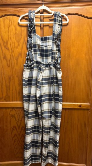 Mono largo con estampado de cuadros. - Diseño con volantes en los tirantes. - Piernas anchas.