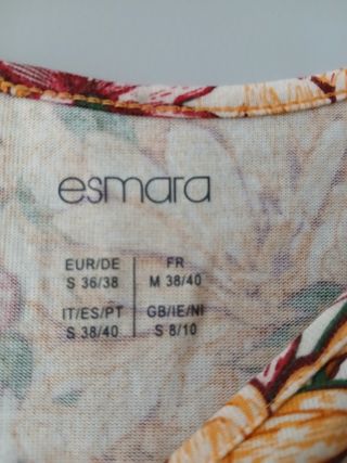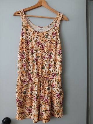 Mono corto con estampado de flores. Cintura ajustada con goma. Escote en V con botones. Forro en la parte inferior, en el pantalón. Talla 38/40.
