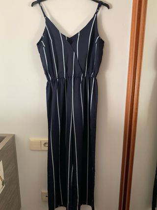 Mono azul marino de Zaful, estilo similar a Zara. Tiene rayas en azul claro y blanco. Escote en V por delante y por detrás, con tirantes finos. Importante: Es una talla S, pero talla grande, equivale más a una M. Tejido fluido y cómodo, ideal para el verano. Perfecto tanto para un look casual como para una ocasión más arreglada. Si necesitas más fotos o medidas, no dudes en escribirme.