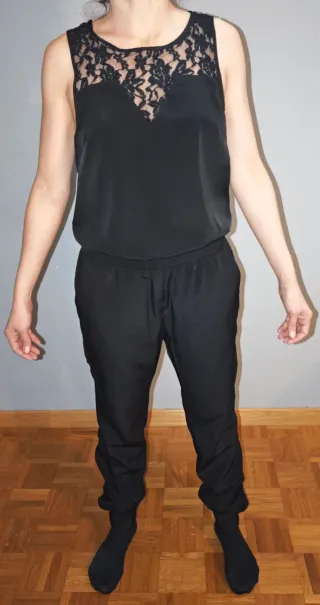 Mono largo de color negro. La parte de arriba es sin mangas, de encaje, y la parte de abajo es un pantalón largo liso. Tiene dos bolsillos. Está sin estrenar, con la etiqueta. El precio original era 119,99€.
