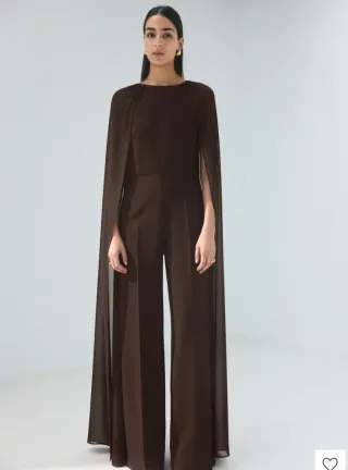 Elegante mono de color marrón chocolate. Presenta un diseño con mangas tipo capa y aberturas. Lucido por Rocío Osorno - Manga larga con aberturas. - Pantalón de pierna ancha.