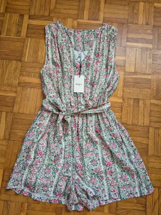 Precioso mono corto de la marca ZARA en color beige. Es una prenda delicada y elegante, ideal para cualquier ocasión. - Es de manga corta. - Tiene un diseño favorecedor con cintura elástica. - La tela es suave y ligera.