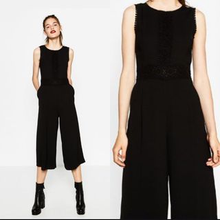 Mono negro tipo culotte con detalle de puntillas y encaje. Bolsillos laterales. Cierre por cremallera en la espalda.Talla S