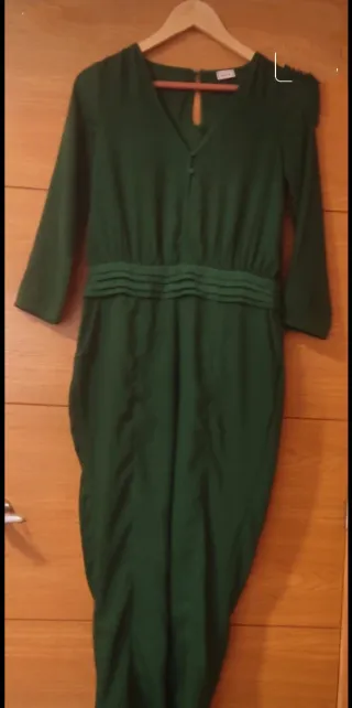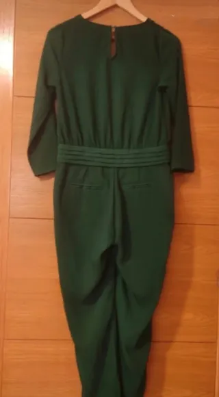 Bonito y elegante mono largo de Sfera, talla S como se ve en la imagen. Escote en forma de pico tanto delantera como trasera, cremallera trasera. Fajin incorporado a nivel del ombligo mas o menos. Manga corta. Pantalon ancho. El color es mas tirando a verdoso que azul como se ve en la foto.