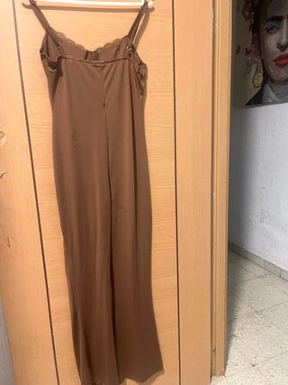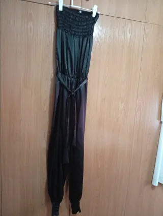 Mono elegante con diseño palabra de honor y espalda descubierta. - Corte favorecedor. - Tejido satinado. - Está bastante arrugado por guardarlo doblado, pero se puede planchar y queda perfecto.