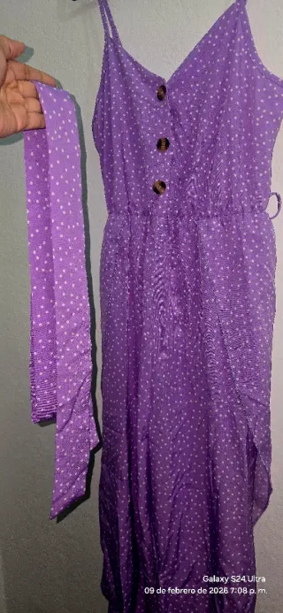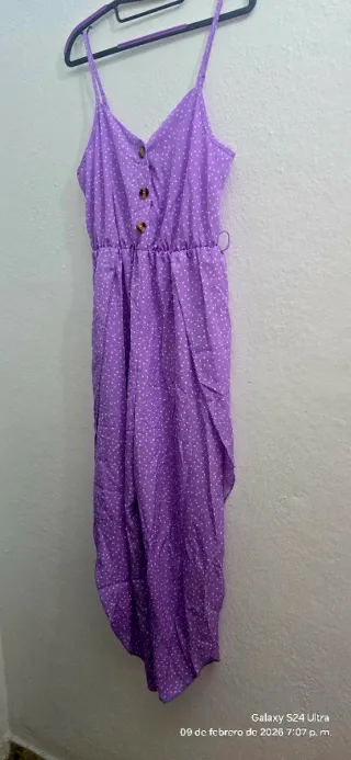 Mono largo de verano con un estampado de lunares blancos sobre fondo morado. Tiene un diseño fresco y ligero, ideal para días cálidos. - Cierre de botones en la parte delantera. - Cintura elástica para un mejor ajuste. - Tirantes finos. - Bajo asimétrico.