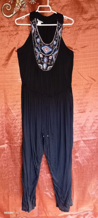 Mono de verano negro con un diseño bordado en el escote. - Escote con detalles pedrería y bordado en tonos azules, rosas y plateados. - Cintura elástica con cordón ajustable. - Piernas largas y fluidas.