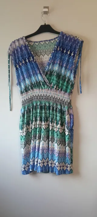 ¡NUEVO SIN ESTRENAR! Precioso mono corto (playsuit) con estampado geométrico en tonos azules y verdes. Talla: M/L (cintura elástica muy adaptable). Detalles: Escote cruzado y lazos ajustables en los hombros. Estado: A estrenar, tejido muy ligero y fresco para el verano. #MonoNuevo #Playsuit #TallaML #ModaVerano #NuevoSinEstrenar #EstiloBoho #ZigZag #Oportunidad #VintedSpain#Dabutong
