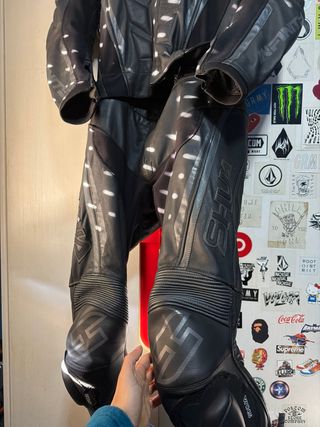 Mono de moto de cuero negro de la marca Shua. Es dos piezas - Talla L. - Diseño deportivo con detalles blancos. - Cremallera frontal.